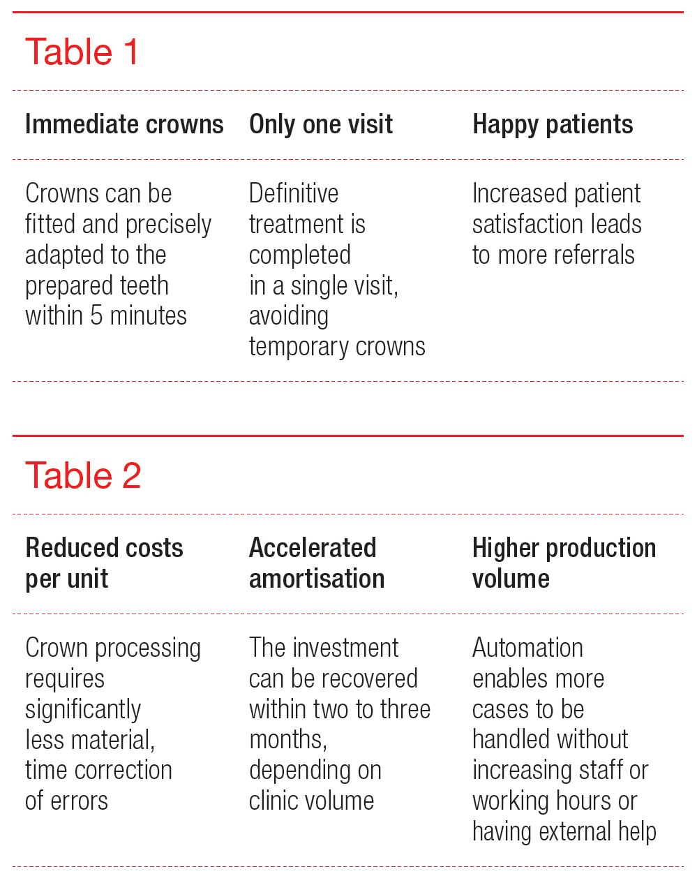 The Midas 3D-printing system offers important clinical advantages in the chairside environment, allowing definitive crowns to be manufactured in just 5 minutes, perfectly adjusted to the prepared tooth. Thanks to this speed and precision, treatment can be completed in a single visit, eliminating the need for temporary crowns or second appointments. Not only does this save the practitioner time, but it also significantly improves the patient’s experience. The speed, convenience and quality of the final result translate into greater satisfaction, which in turn supports patient loyalty and promotes recommendation (Table 1).